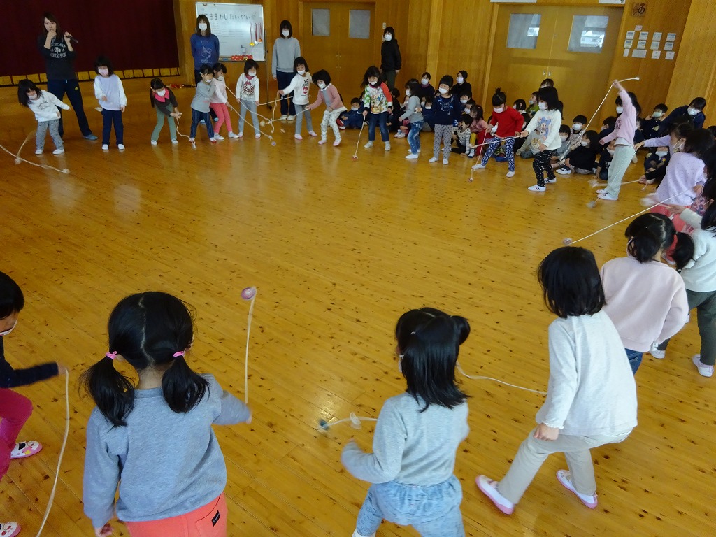 未満児さんと年少さんは手で回すこまに、年中さんと年長さんはひもごまに挑戦しました。