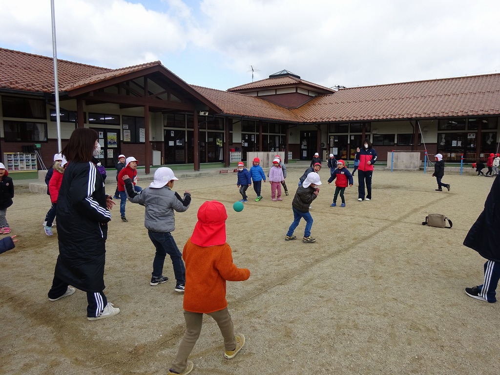 きたこども園に戻り、おいしいお弁当を笑顔いっぱいでいただいた後は、いよいよきたこども園の年長さんとのドッジボール対決!です。