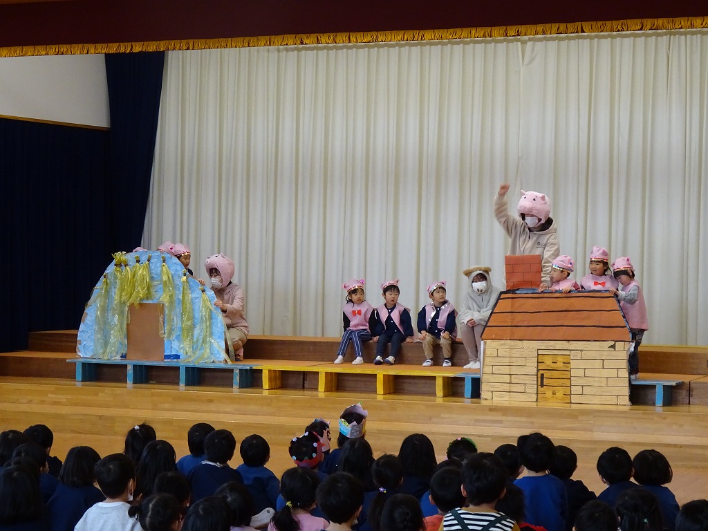 今月は15名のお友だちが誕生日を迎えました。 3月生まれのお友だちは大きな声で堂々とインタビューに答えてくれました。 お楽しみでは、年長・年中の誕生児が保育士と一緒にオペレッタ「三びきのこぶた」に挑戦しました。 少し照れながらも楽しく、そして可愛く演じてくれました。