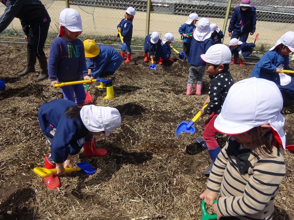 今年度も「土にふれ収穫する喜び・自然のすごさを体感する」を目標に農園活動がスタートしました。 農園開きは年長さん、年中さんで行いました。 年中さんはスコップで、年長さんは耕運機を運転させてもらい、畑の先生・都筑さんと一緒に畑を耕しました。