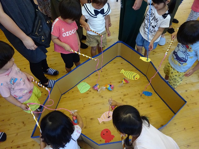 池の中には自分たちが作った魚の他にも、大きな魚やタコがいて大賑わい! みんな次々と釣り上げて大満足! お家の方もとても楽しそうで、親子で楽しい時間を過ごすことができました。 お家の方と一緒に活動することをずっと楽しみにしていた子ども達。 魚の製作も、魚釣りも、みんな笑顔がキラキラ輝いていました。 お忙しい中参加してくださり、ありがとうございました。