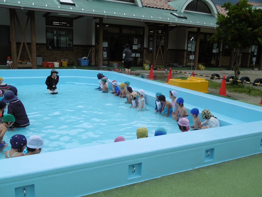 始めに年長さんのプール遊びを見学して、プールの入り方などを勉強してからスタートしました。 少し緊張気味の子もいましたが、予習をしたことで安心して入ることができました。 水は少し冷たかったですが、水鉄砲で遊んだりと、元気いっぱい大喜びの子ども達でした。 2ヵ月間、安全第一で楽しく元気にプール遊びを行います!