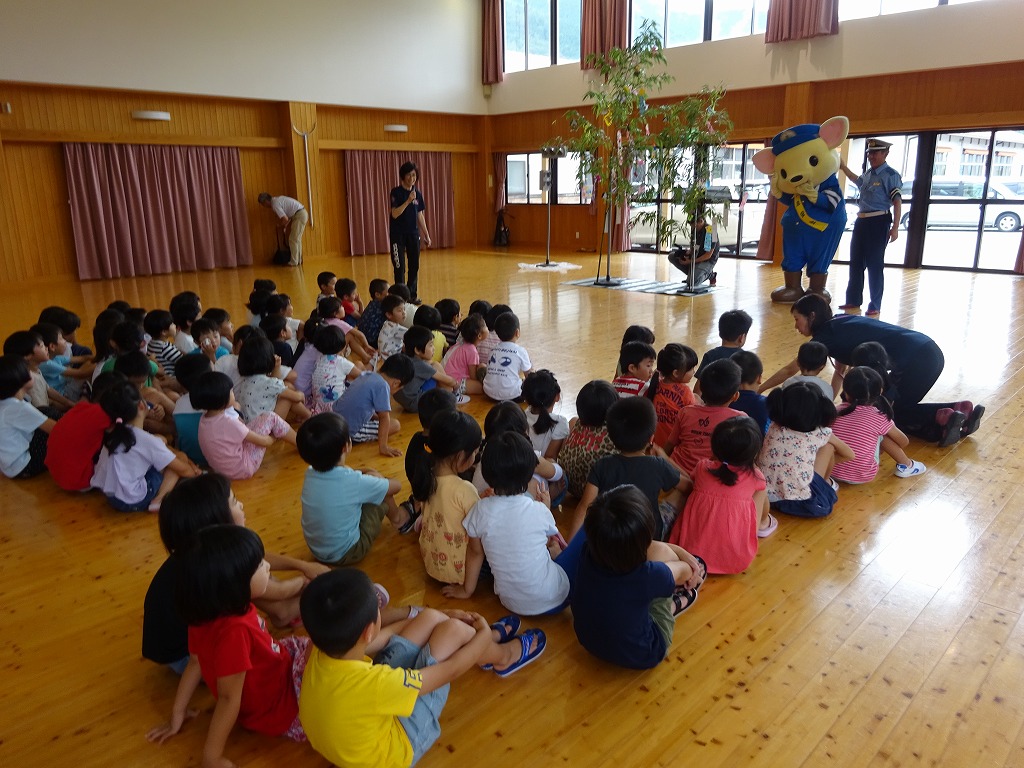 下呂警察署の方が来て下さり、年長さんが交通安全祈願祭に参加しました。 おまわりさんの話を真剣に聞き、横断歩道の渡り方をこあんちゃんと確認しました。 5月の交通安全講話で確認した3つの約束を改めて約束し、交通安全の願い事を書いた短冊を笹に飾りました。