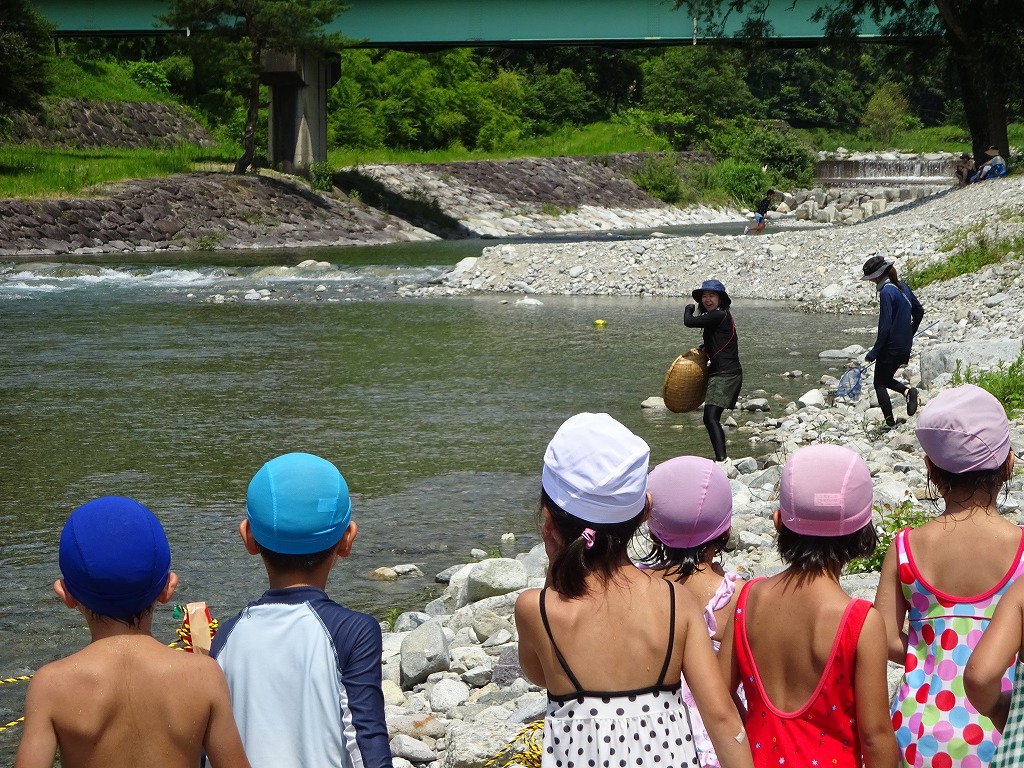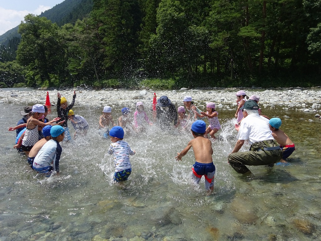 いざ川に入ると、プールとは違う水の冷たさに「冷たい!」と驚いていましたが、川ならではの水の流れや足場の楽しさに気付き、泳いだり潜ったり歩いたり…体をいっぱい動かしていました。 サプライズで、上流から!スイカがどんぶらこっこ! みんな大喜びで、大きなスイカをペロリと完食しました。 大自然のなかで自然のパワーや楽しさを思う存分感じ、ステキな思い出の1ページになったと思います。