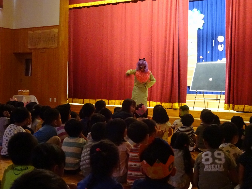 お楽しみは、『おばけマンション』のパネルシアターでした。 電気が消え、色々なおばけがマンションから出てくると怖くて泣いてしまう子もいましたが、 最後までみんな楽しんで見ていました。 8月生まれのお友だち、お誕生日おめでとう!!