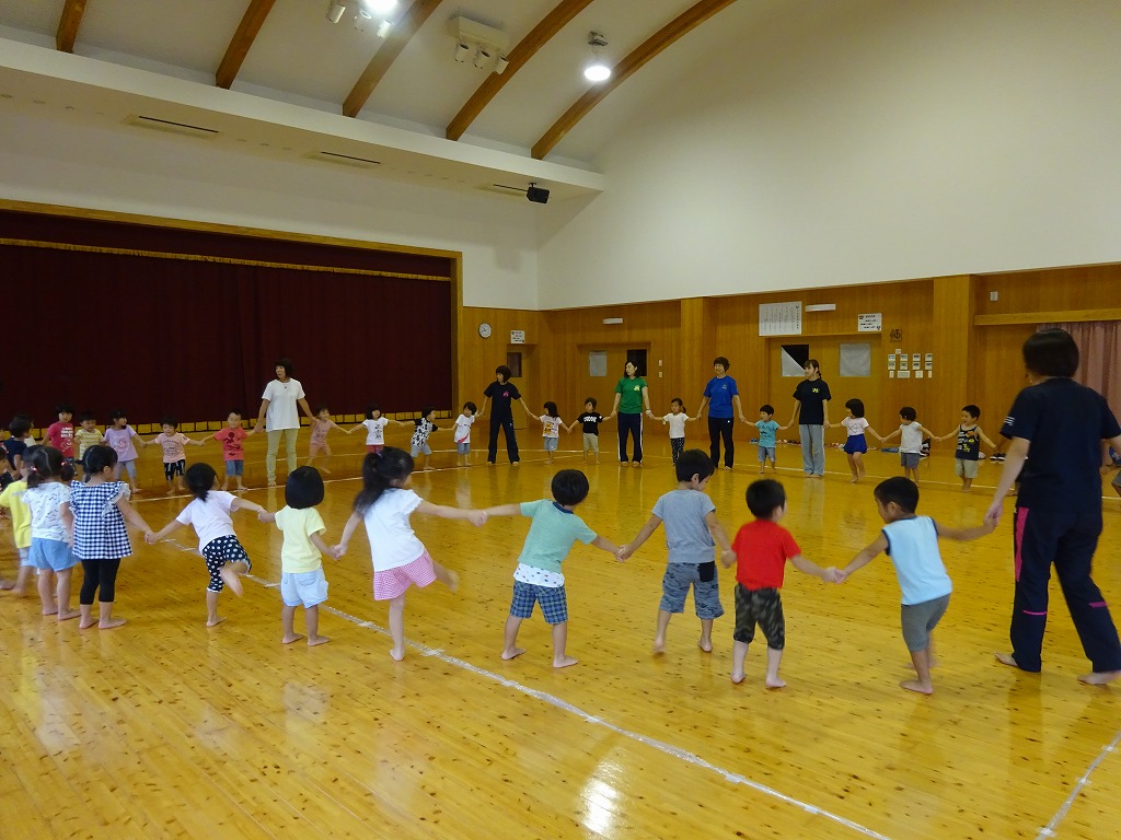 静かに耳を澄ませる子ども達の姿がみられました。 その他にも、両手を広げて片足立ちをしてトンボになりきったり、げんこつやまのたぬきさんに合わせてペア活動をしたりと、リトミックの先生と一緒に楽しく体を動かして遊ぶことができました。