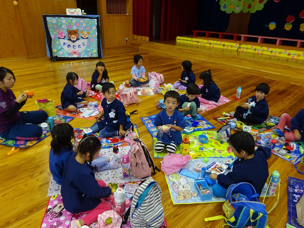 園の周辺に散歩に出掛け、向かった神社では宝探しをして、見付けたおやつを食べました。 途中で小雨が降り出して慌てて戻りましたが、たけはらこども園のきれいな遊戯室で、 愛情たっぷりのお弁当を嬉しそうに見せ合いながら食べ、楽しい時間を過ごすことができました。
