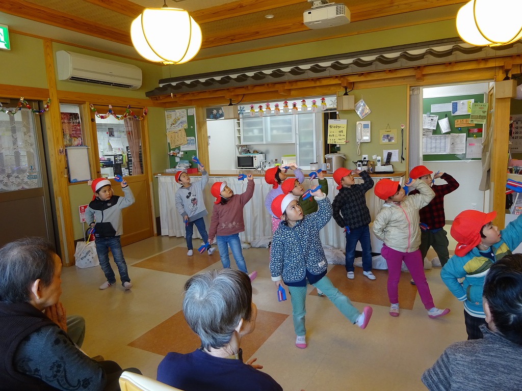 今回はゆり組さんが、収穫した大根をもって訪問に出掛けました。 歌や、発表会で踊った「海の声」を披露しました。 少し緊張していた子ども達でしたが、喜んで下さる姿を見てとても嬉しそうでした。