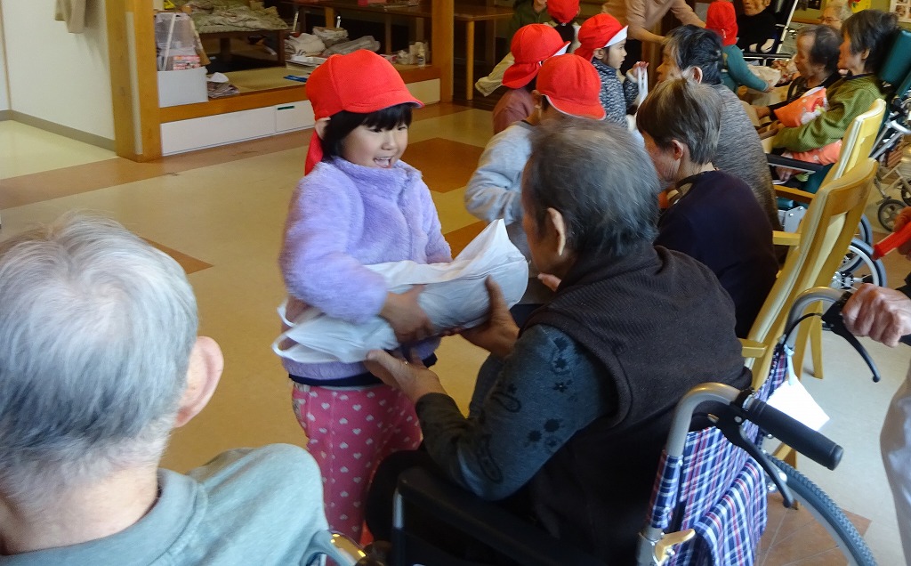 大根も直接渡すことができ、触れ合うだけでなく、たくさん話をすることができました。 おじいちゃんおばあちゃんの歳を聞いて、「すごーい!」とビックリする子ども達! 温かい雰囲気の中で、楽しいひと時を過ごすことができました。