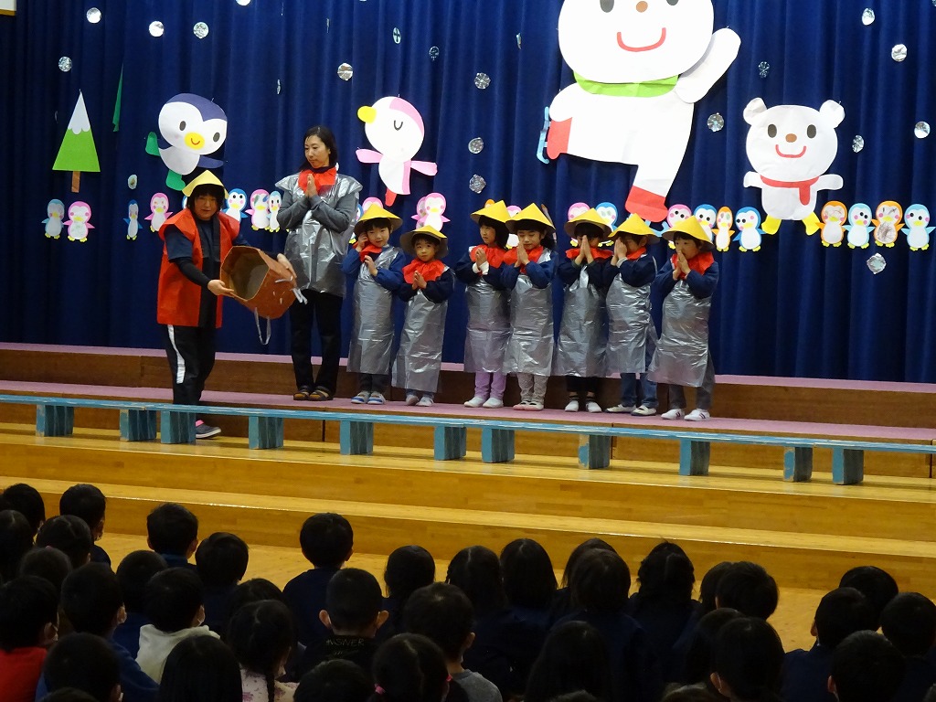 今月のお楽しみは、“かさじぞう”の劇でした。 お地蔵さんをよく見てみると… お地蔵さんは12月生まれの年長さん!とても上手に演じてくれました。 12月生まれのお友だち、お誕生日おめでとう!!