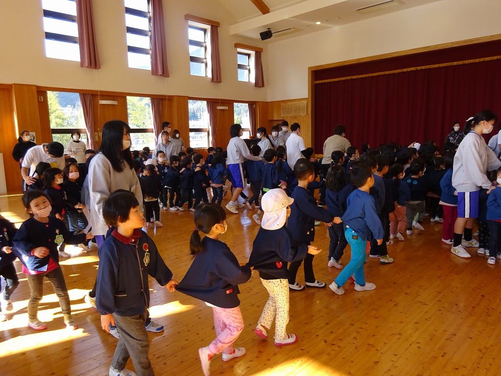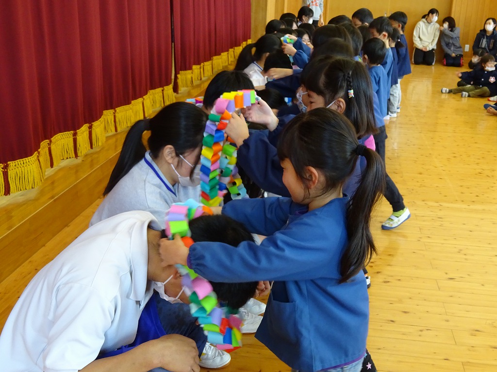 最後は「ありがとう!」の気持ちを込めて、各クラスで作った首飾りをプレゼントし、花道を作ってお兄さんお姉さんを見送りました。