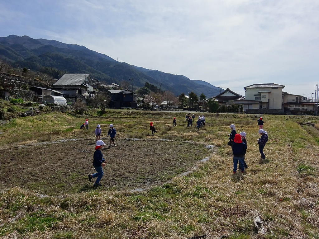 その後は、クラスごとにそれぞれの思い出の場所へ・・・ 田んぼ・どろんこ広場・諏訪神社・畑など、今までの色々な経験を振り返りながら、のんびりと歩き、 それぞれの場所で思い切り遊んできました。 帰る頃には、「楽しかったー!」「お腹ペコペコ〜!」と大合唱の子ども達でした。