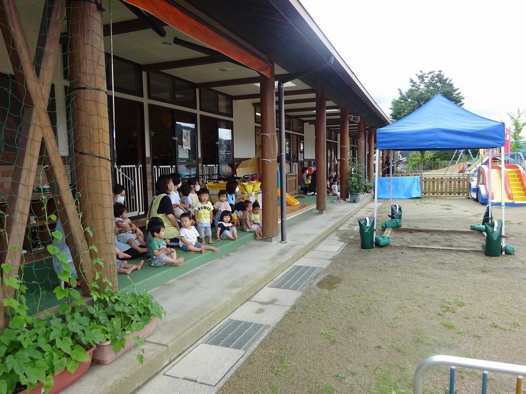 未満児さん・年少さんはテラスから避難の様子や、保育士がサスマタを使って不審者に向かうところを真剣に見てくれていました。
