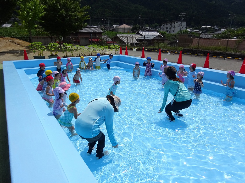 雨が続いて、なかなかプールに入ることが出来なかった年少さん… 今日は、待ちに待ったプール開きをすることができました!