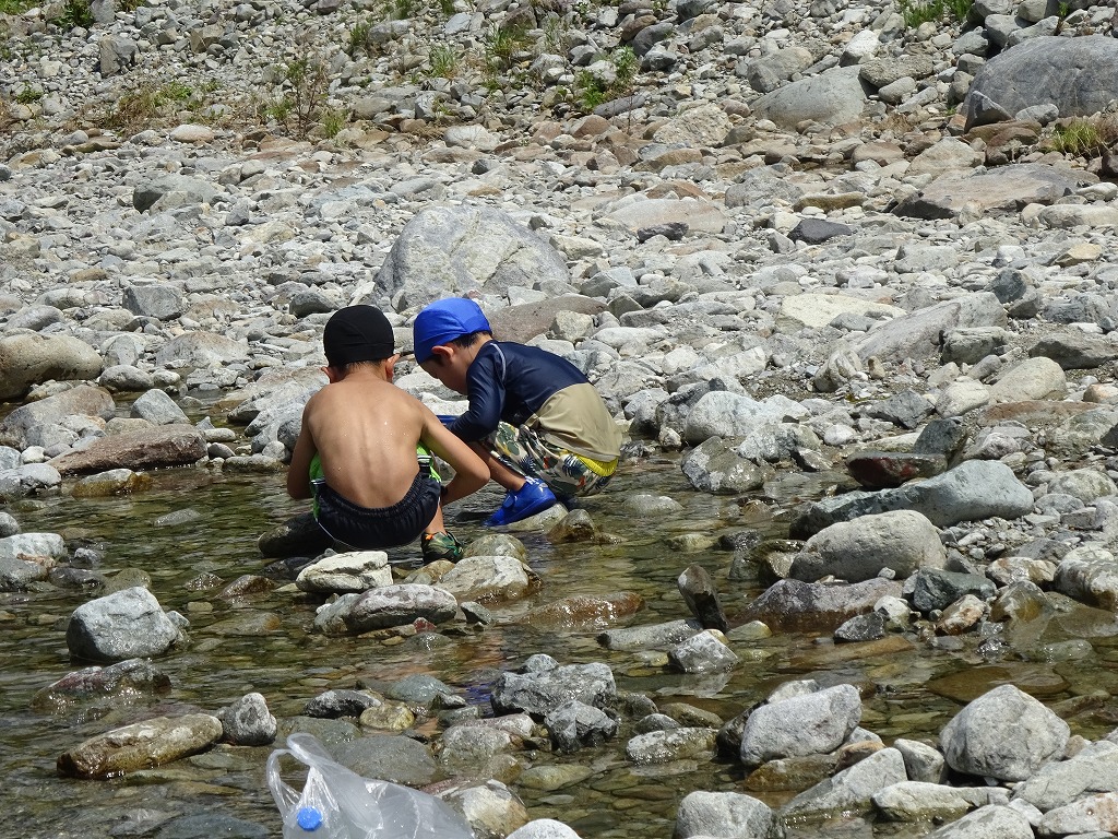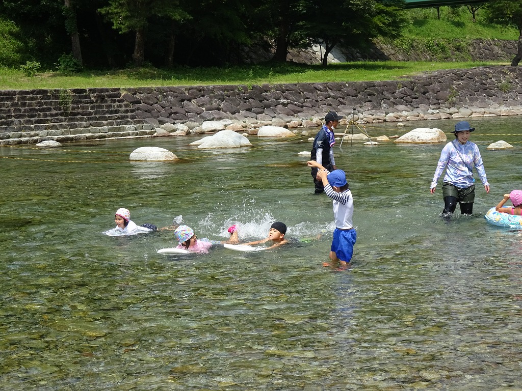 川の中に入って、ビート板を使って泳いだり、浮輪を使って川の流れに身を任せたり、魚を探したり… それぞれが楽しく遊ぶことができました。 「まだ遊びたい!」「また行きたい!」 川遊びを大満喫したたんぽぽ組さんでした♪