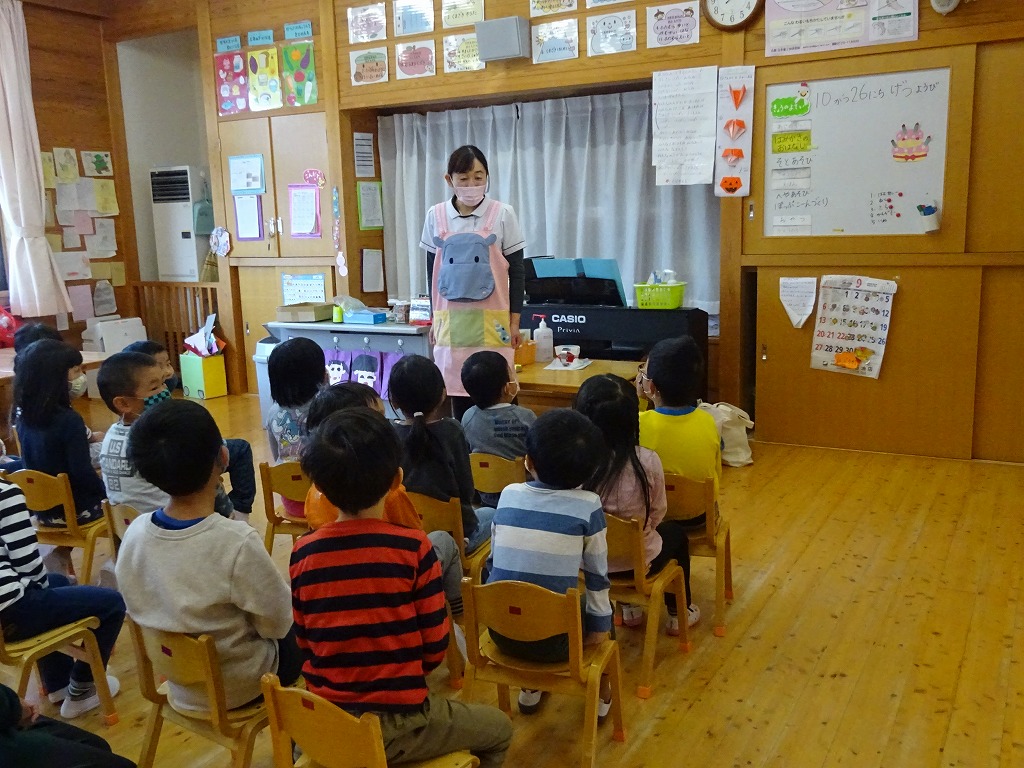 何かできないかと工夫していただき、歯の染め出し、磨き残しのチェック、仕上げ磨きは中止し、エプロンシアターで歯磨きの大切さ、歯の模型で歯磨きの仕方を教えてもらいました。