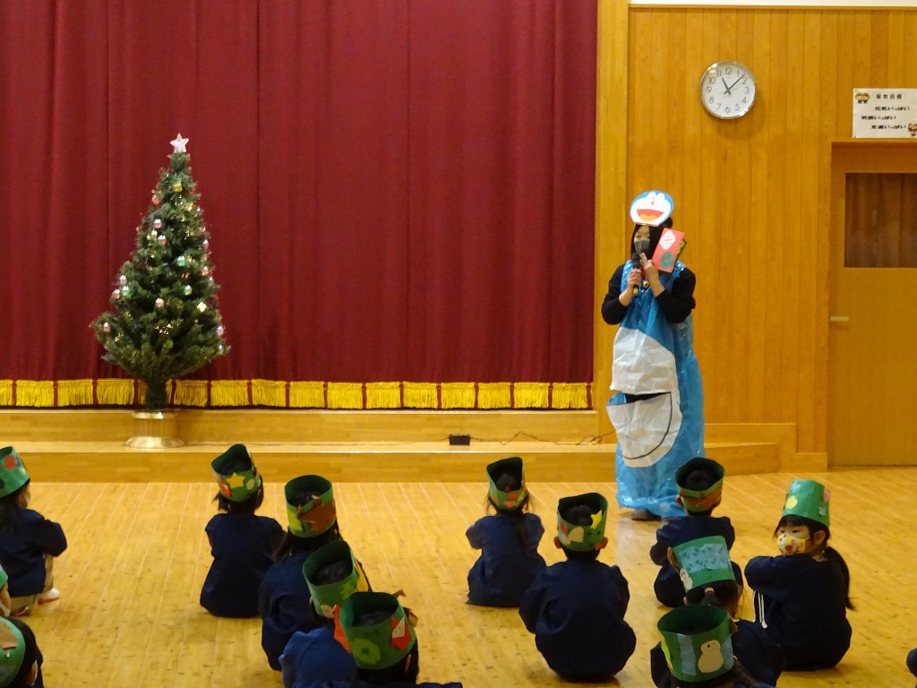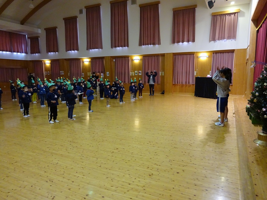 今年のクリスマス会は学年ごとに行いました。 子ども達は、手作りの帽子をかぶって元気に参加しました♪ 先生からは、歌に合わせた“クリスマスブラックシアター”のプレゼント!
