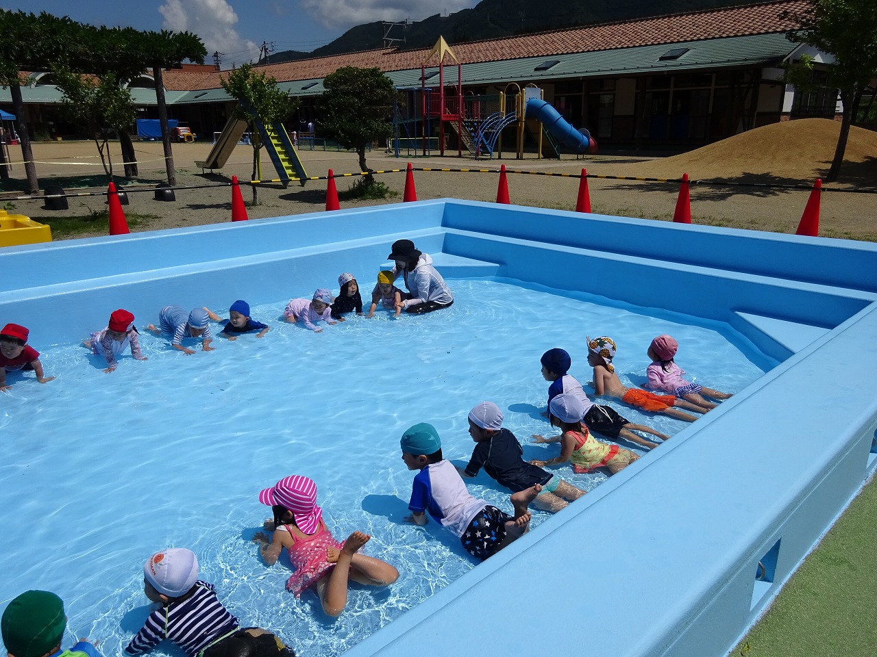 初めてのこども園でのプール遊び!喜んで遊ぶことができました。