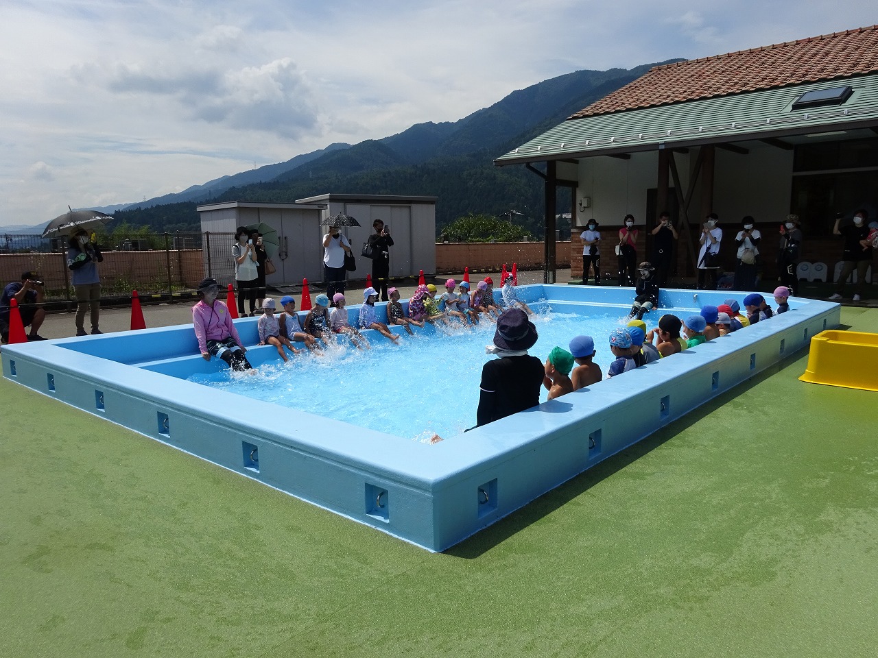 子ども達は、少し緊張しながらも、お家の方が見に来てくれることを楽しみにしていました。 年中さんになり、フープくぐりやワニ泳ぎ、顔付けなど、去年よりできるようになったことが増えました。 「見て見て〜!」と、体全体で水遊びを楽しみ、自信をもって取り組む姿を観てもらうことができました。 暑い中、参観いただきありがとうございました。