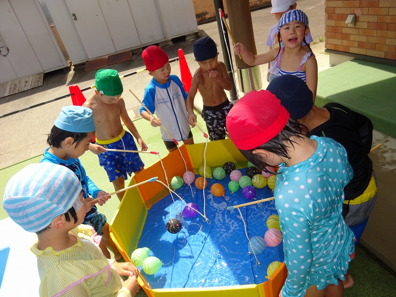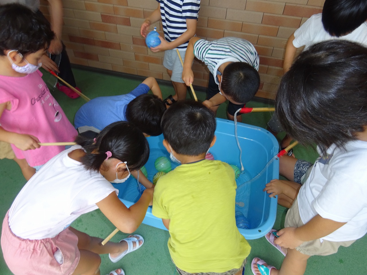 今月のお楽しみは、プールに移動して「ヨーヨ釣り」を楽しみました。 「ヨーヨーだ!」「見たことある!」と、目を輝かせる子ども達! 慎重に竿を操り、「釣れたよー!」と大喜びでした。 コロナ禍のため、各地のお祭りも自粛となっていますが、園でちょっとしたお祭り気分を味わうことができてよかったです。 8月生まれのお友だち、お誕生日おめでとう!