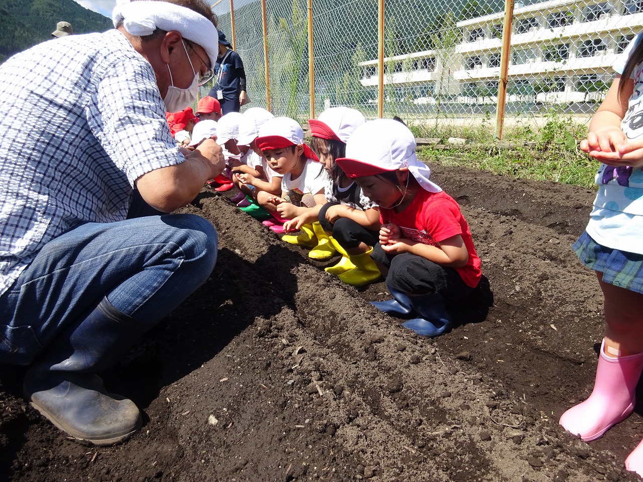 未満児さんは、お兄さんお姉さんが種をまく様子を見学し、その後、こあら組さんも種まきを体験しました。