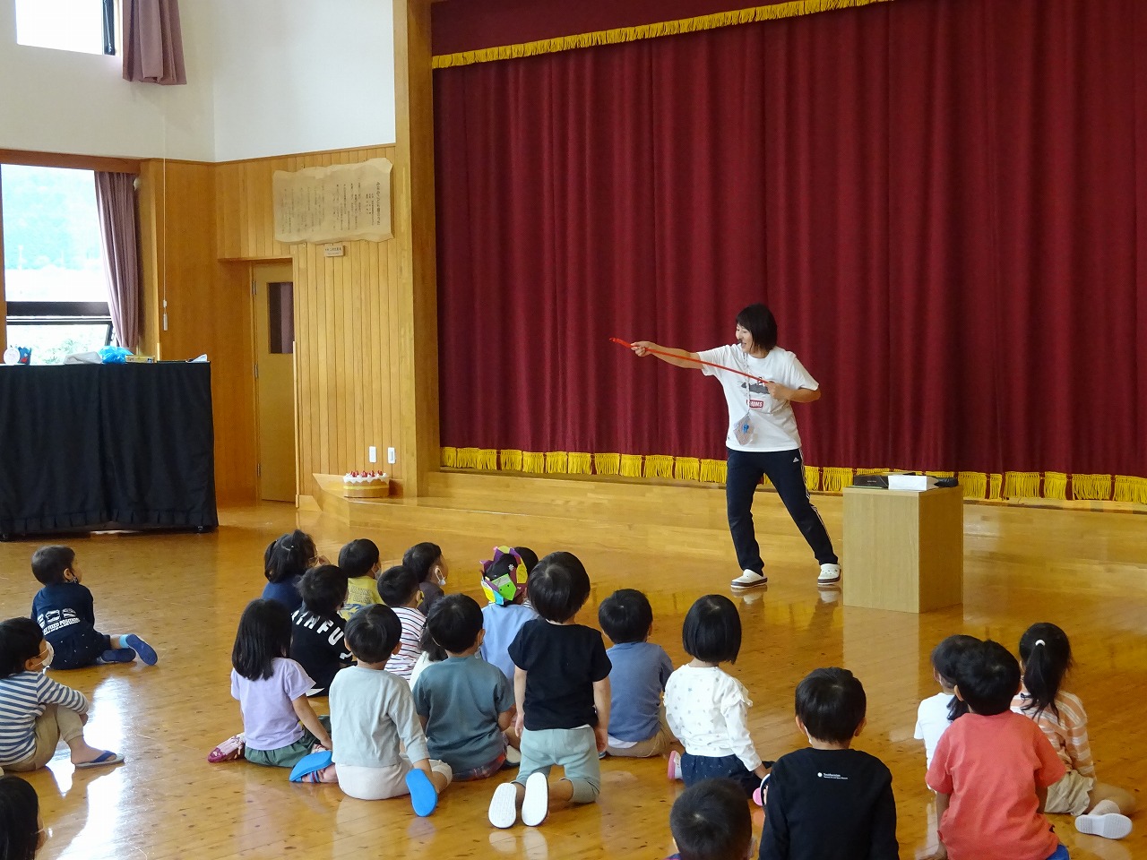 今月のお楽しみは、「マジックショー」でした。 グニャグニャの紐がピンッとなったり、ステッキからお花が出てきたり… 子ども達は、「うわ〜!!」と目を輝かせていました。 9月生まれのお友だち、お誕生日おめでとう!!