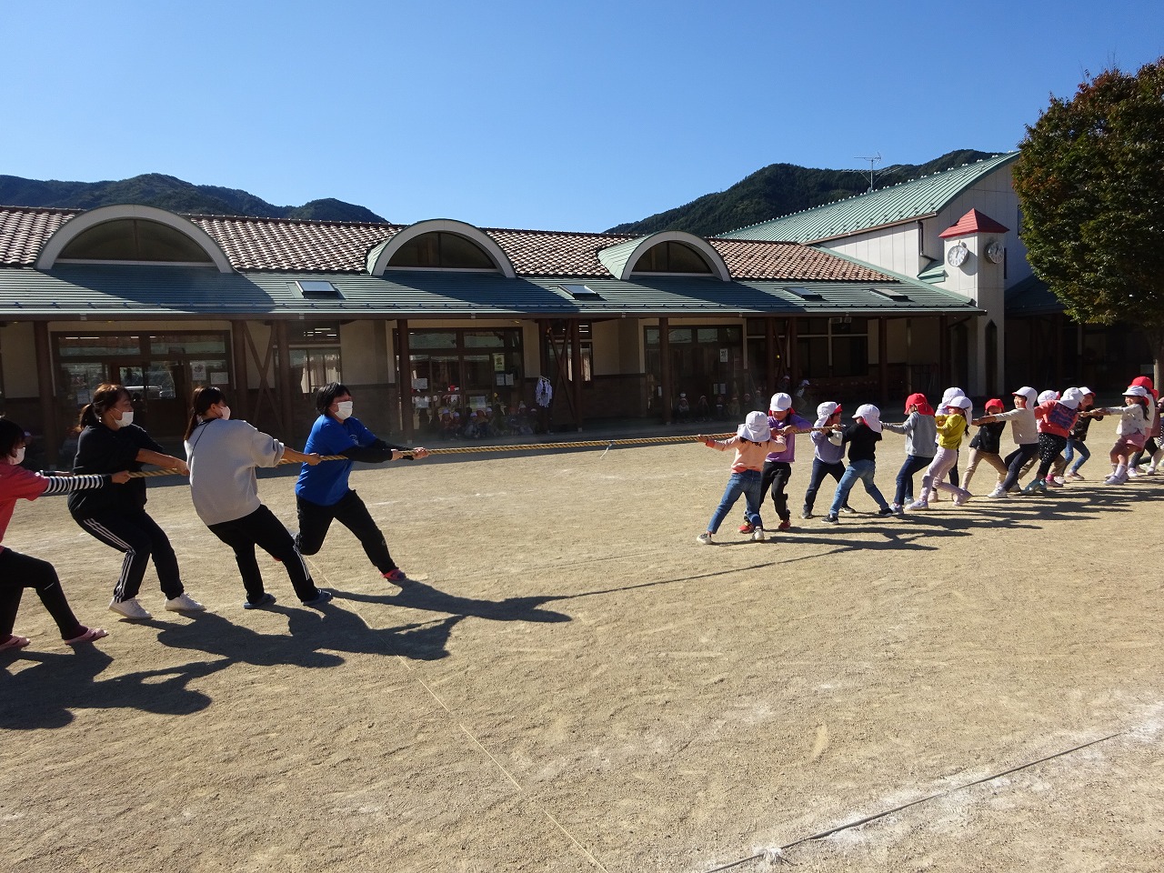 今月のお楽しみは、「綱引き」でした。 年少さんと年中さんはクラス対抗、未満児さんは年少さんと一緒に行いました。 そして、年長さんは、年長さん全員VS保育士! 軍配は年長さんに上がりました。力がすごかったです! 10月生まれのお友だち、お誕生日おめでとう!!