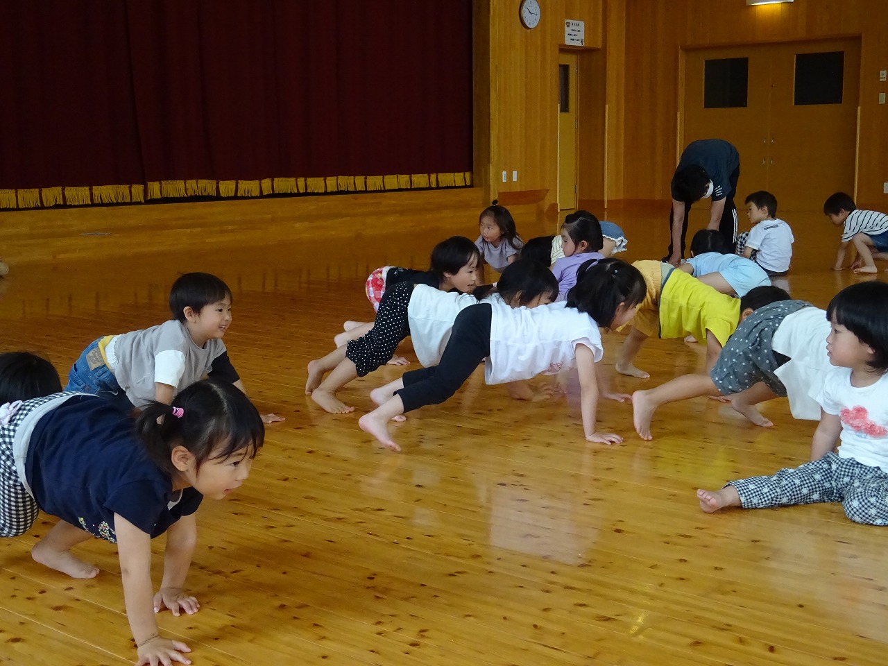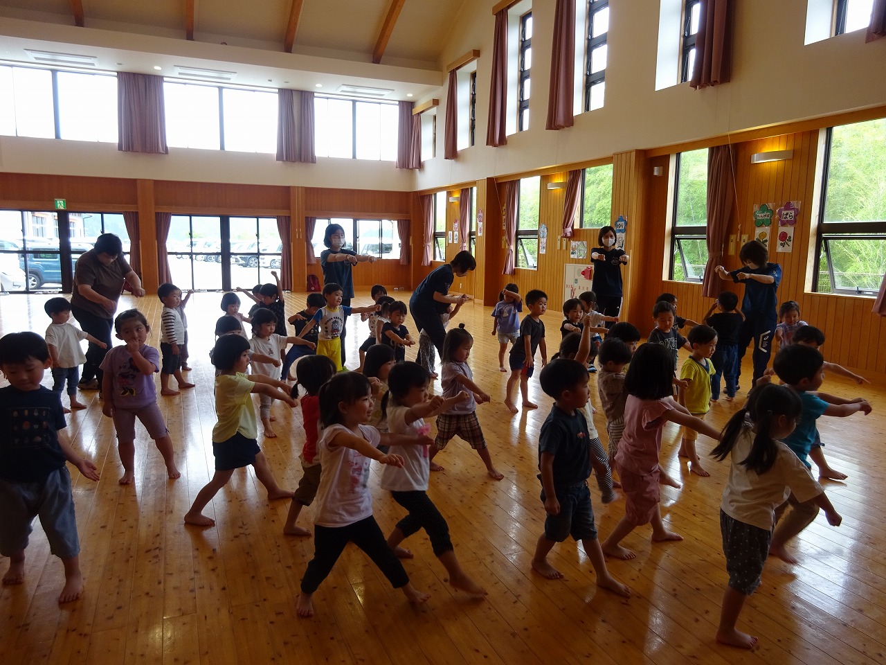 ピアノに合わせて走ったり止まったり、動物になりきったり…たくさん体を動かしました。