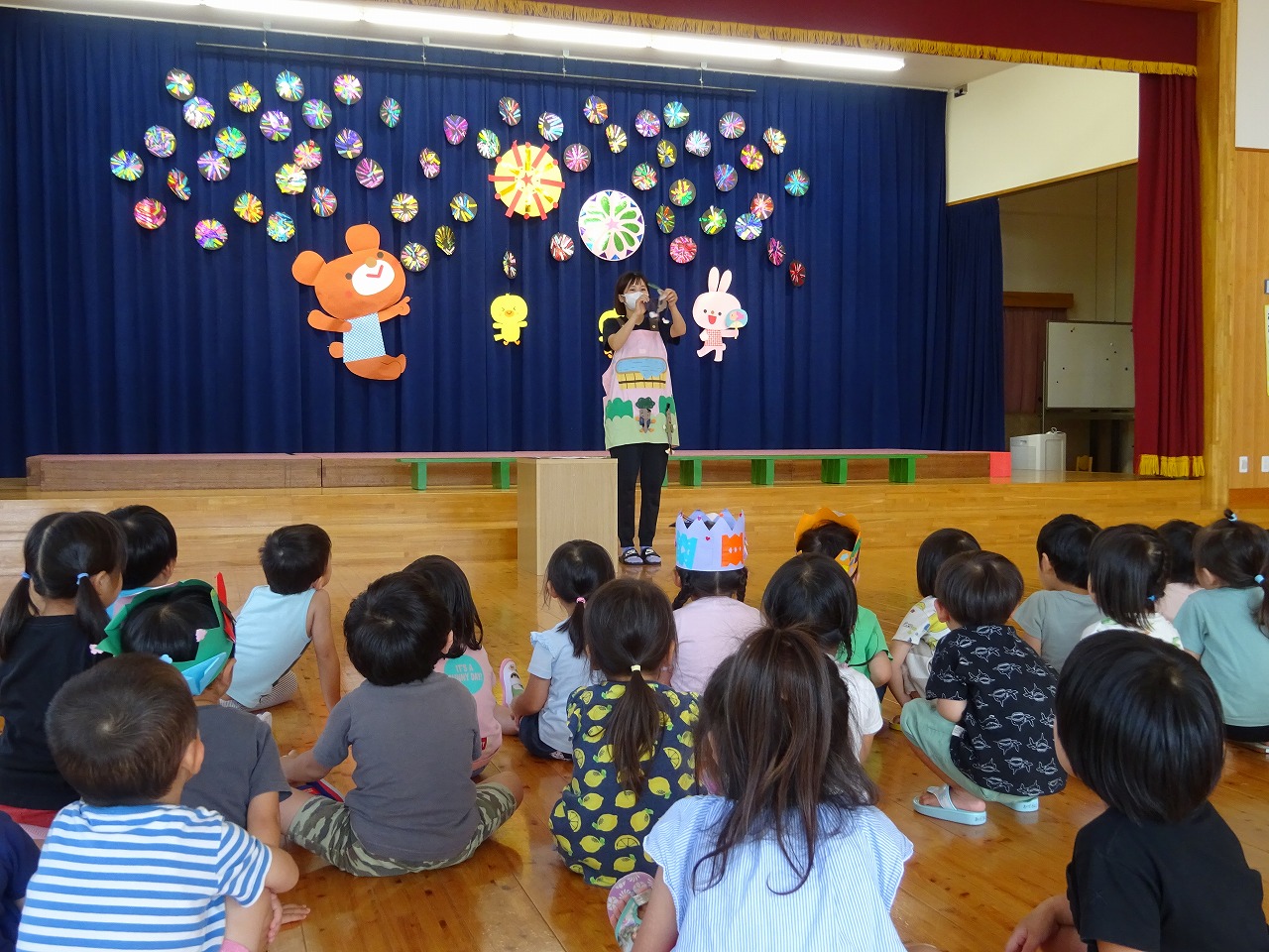 お楽しみは、エプロンシアター「にんじんさんはなぜ赤い」でした。 にんじん、だんこん、ごぼうがお風呂に入る様子を、みんな集中して観ていました。