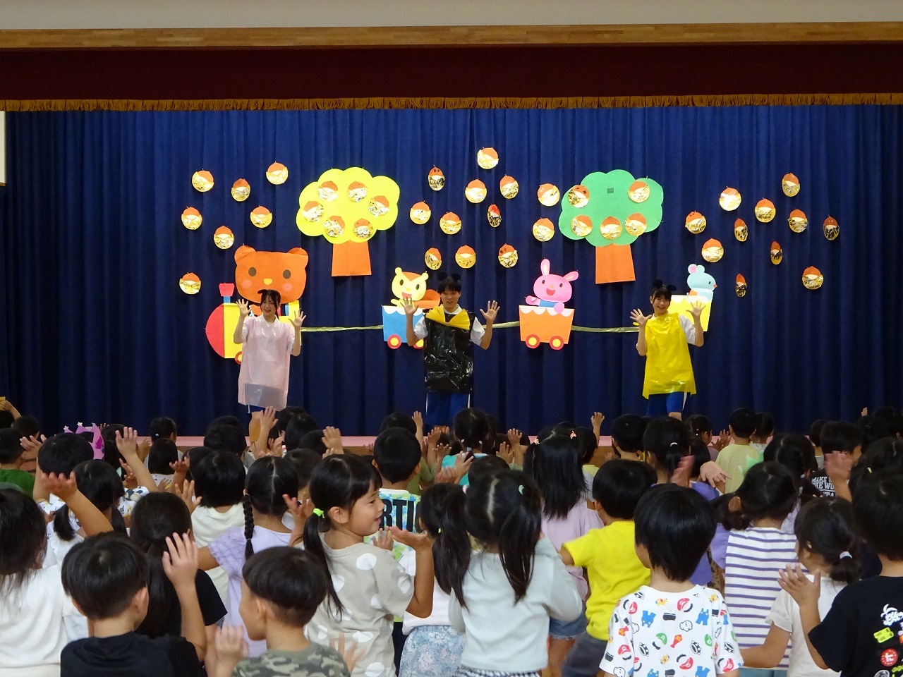 今月のお楽しみは、益田清風高校から実習に来てくれるお兄さんお姉さんが、 「ハンドベルとジャンボリミッキー体操」を披露してくれました。 大盛り上がりの誕生会でした。 9月生まれのお友だち、お誕生日おめでとう!!