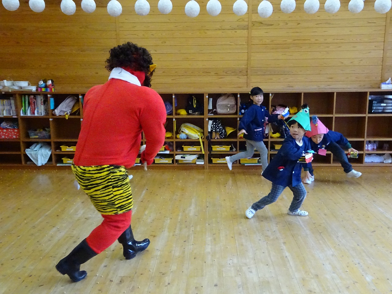 すると、そこへ!本物の鬼が登場!不意を打たれてビックリ仰天しましたが、 「鬼は外!」「福は内!」と大きな掛け声で、鬼に向かって果敢に豆を投げていました。 最後は、園長先生と副園長先生がイワシと柊の葉で鬼を追い払い、鬼は山へと帰っていきました。 一つ逞しくなった子ども達。春はもうすぐそこまで来ていますね。