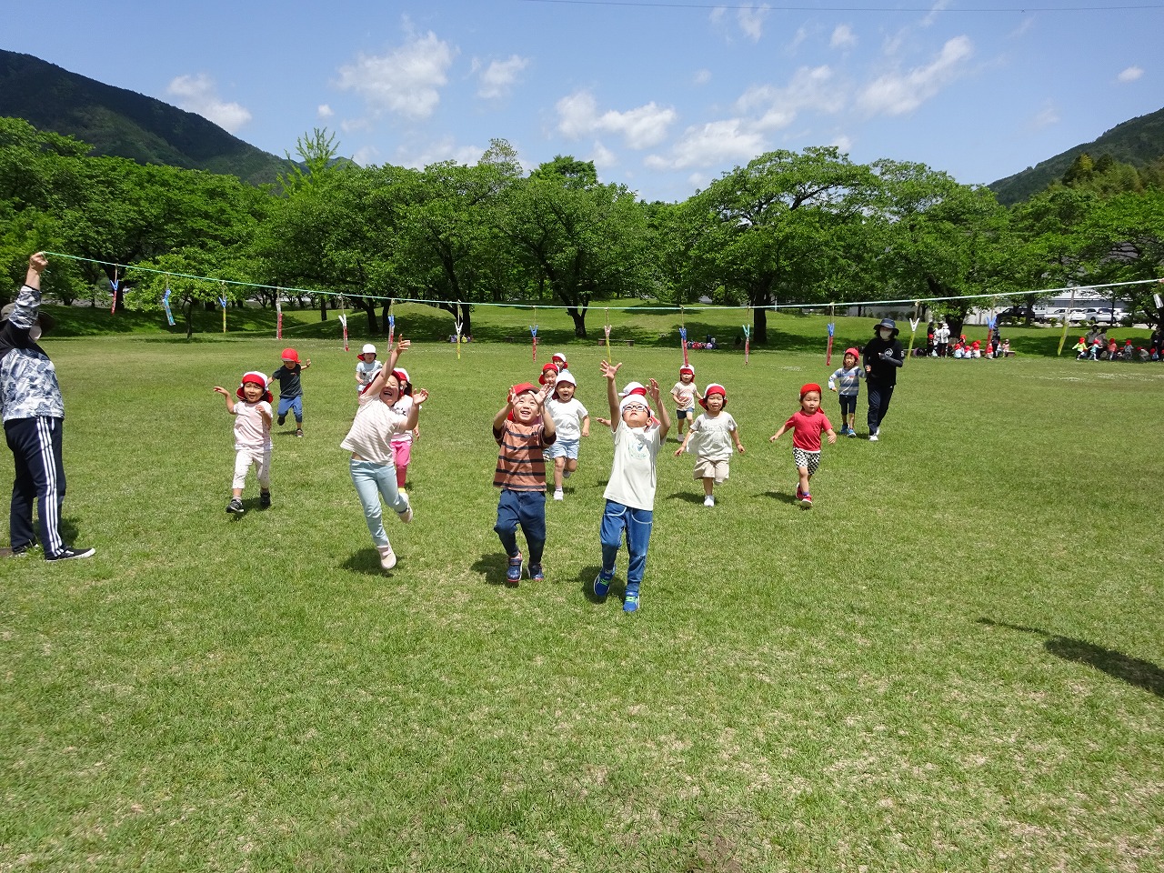 晴天に恵まれ、年少さん、年中さん、年長さんが飛騨川公園へ遠足に出掛けました。