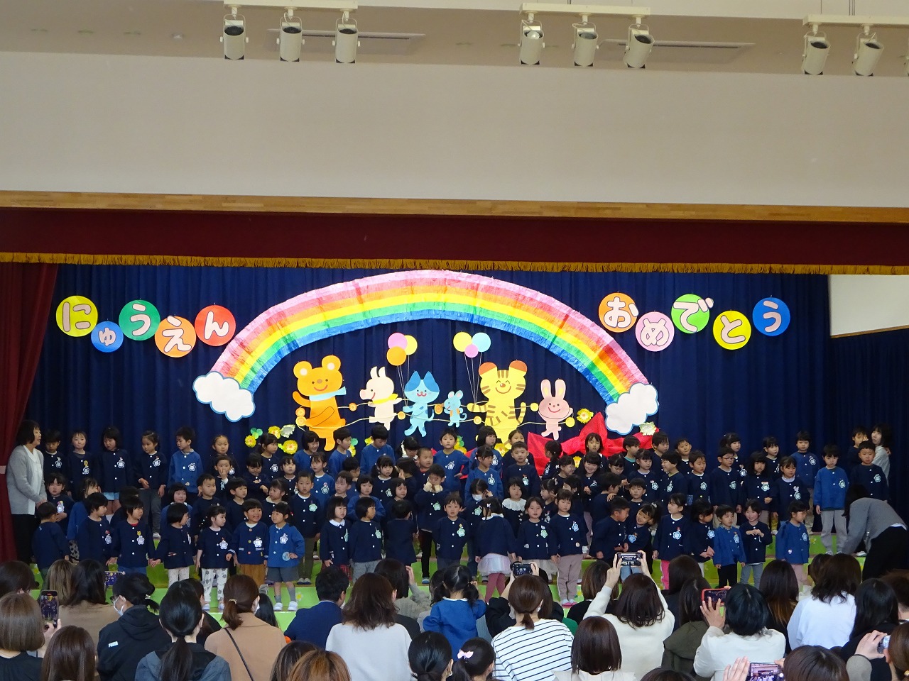 入園式では、名前を呼ばれた年少さん36名が元気にステージに上がり、アンパンマン体操を踊りました。 「元気いっぱい 笑顔いっぱい 友だちいっぱい」園目標通りの一年になりますように!