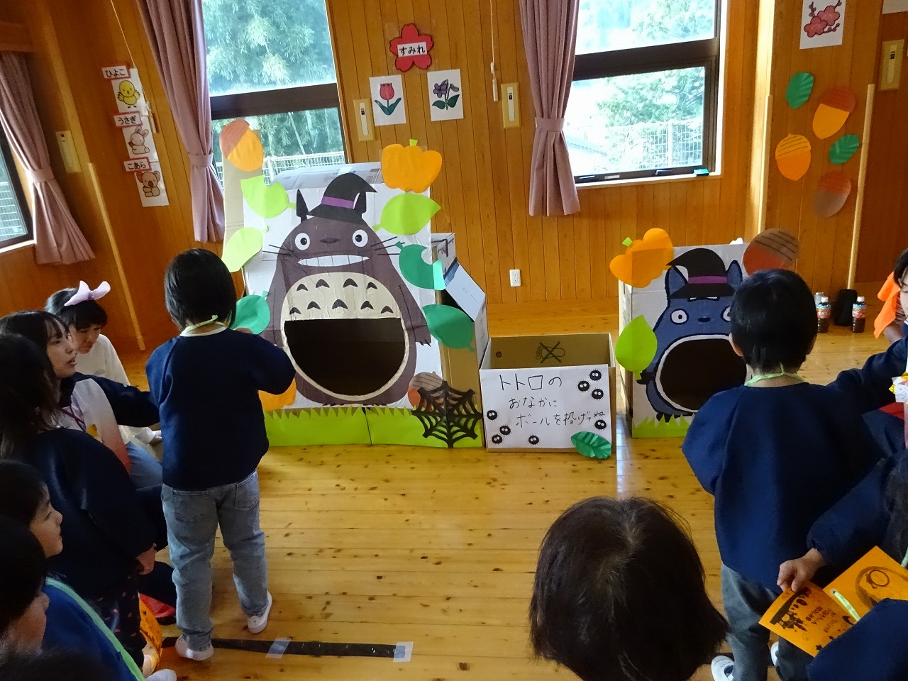 今日は、保護者会主催のお楽しみ会がありました。 役員の方々や、毎月実習に来てくれる高校生のお姉さんたちが、子ども達のためにたくさんの時間をかけて準備や計画をして下さいました。 今年はその名も「みなみのトトロ」!