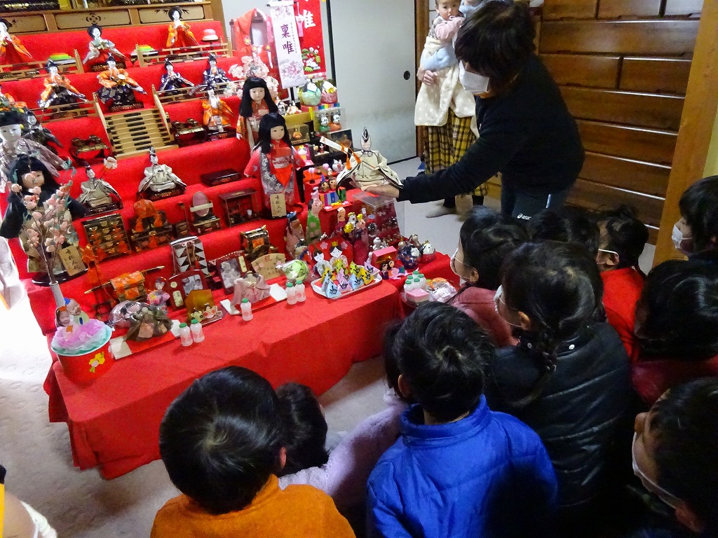 年中さんと年長さんがおひなさま作りの参考にさせてもらうため、地域の方のお宅へ行っておひな様を見せていただきました。 |