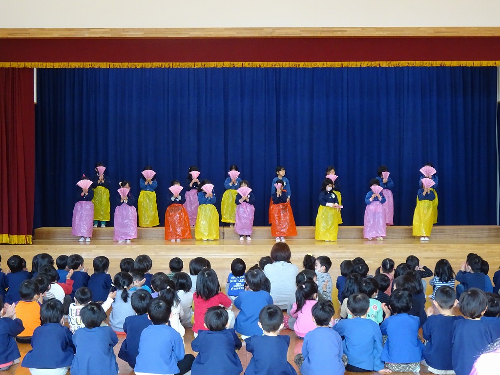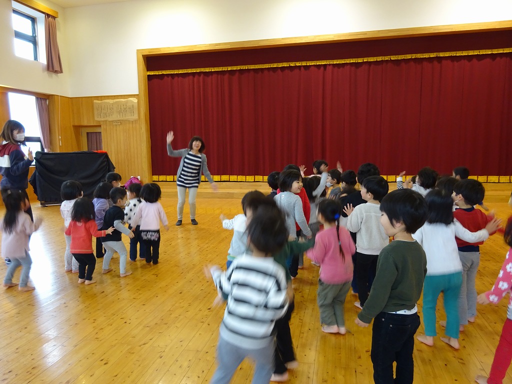 未満児2歳児12名が、年少のリトミックに仲間に入れてもらい、初めてリトミックを体験しました。 |