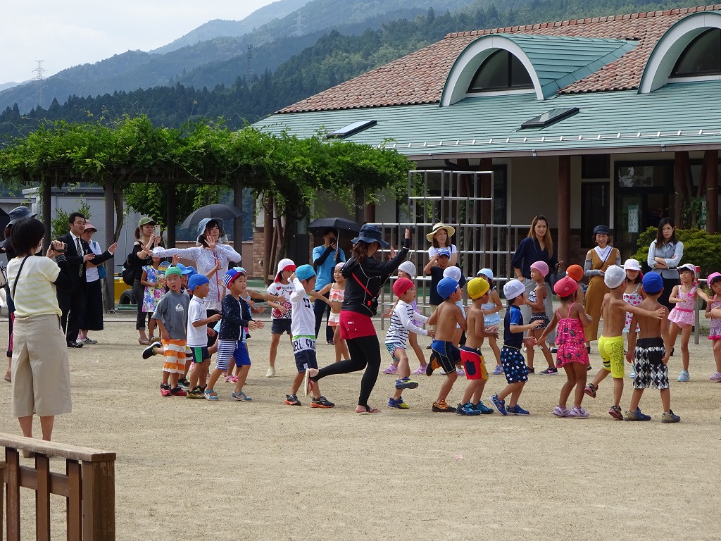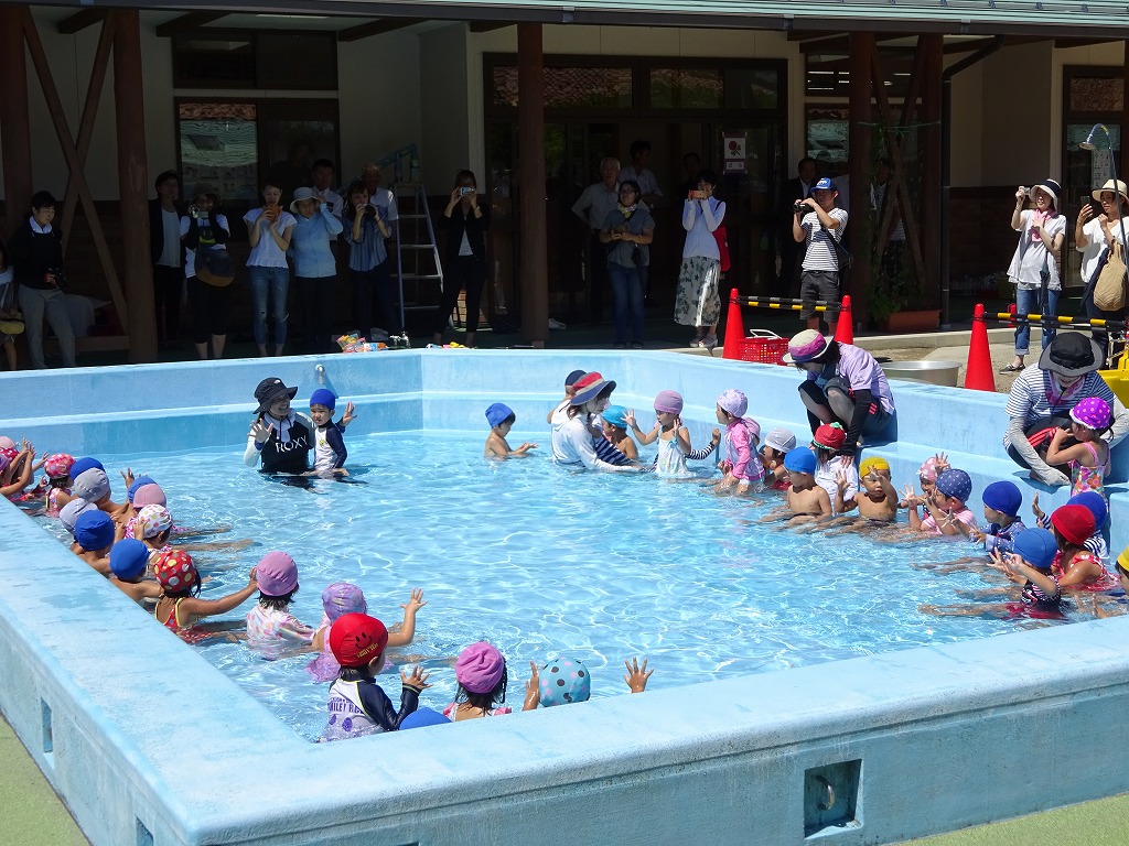 年長さんにとって最後のプール参観となり、子ども達はお家の方に見てもらえることを楽しみにしていました。 |