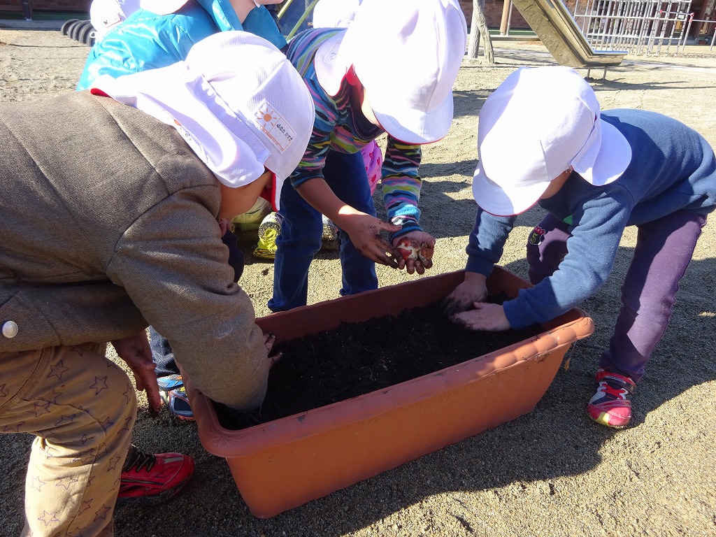 今年も飛騨川公園からちゅうりっぷの球根をいただき、年中さんがプランターに植えました。 |