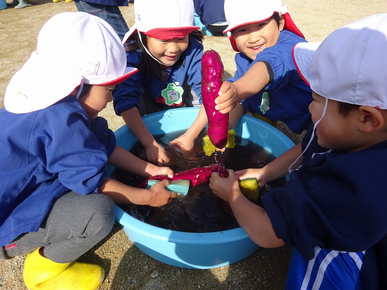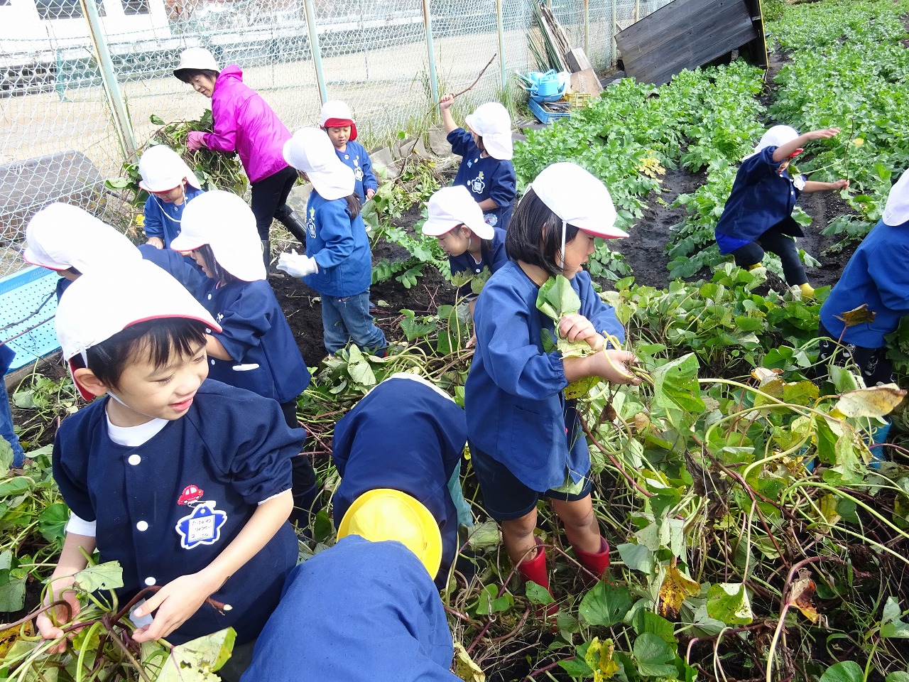 5月にみんなで植えたさつまいも。時々様子を見に出かけ草取りをしながら生長を楽しみにしてきた子ども達は今日のさつまいも掘りをとても楽しみにしていました。 |