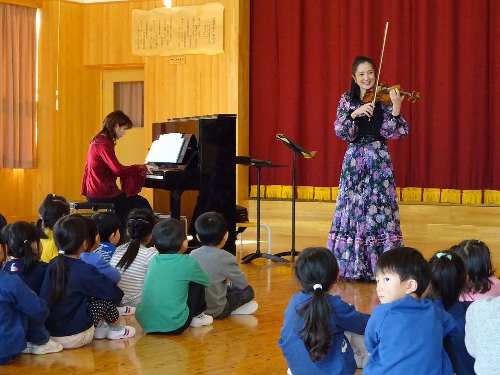 バイオリニストの早稲田桜子さんがみなみこども園で出張コンサートを開いてくださいました。 |