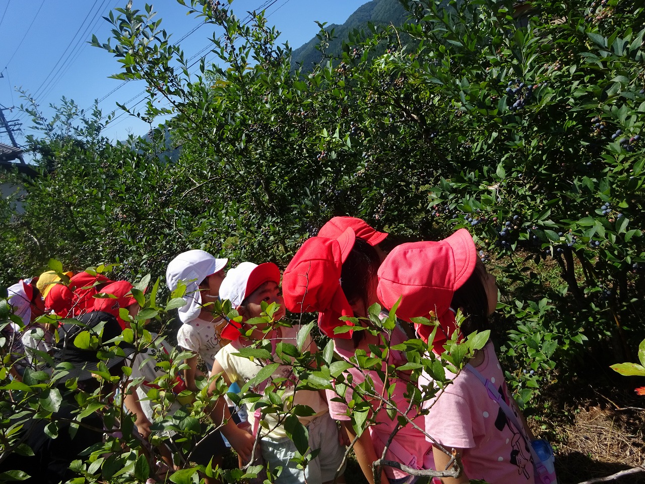 地域にあるブルーベリー農園さんのご厚意で、年長さんがブルーベリー狩りを体験させていただきました。 |