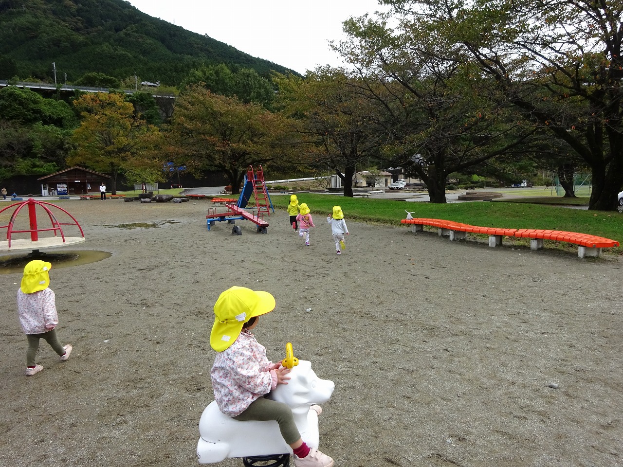 未満児の2歳児さんは、バスに乗って飛騨川公園へ遠足に行きました。 |