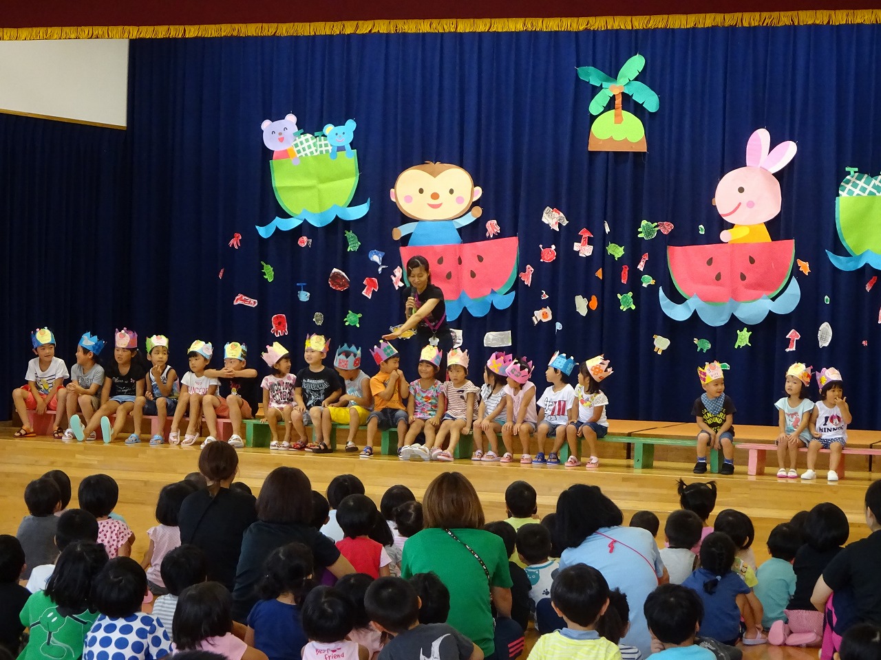 8月生まれ17名と先月欠席した2名、計19名の誕生児をお祝いしました。 |