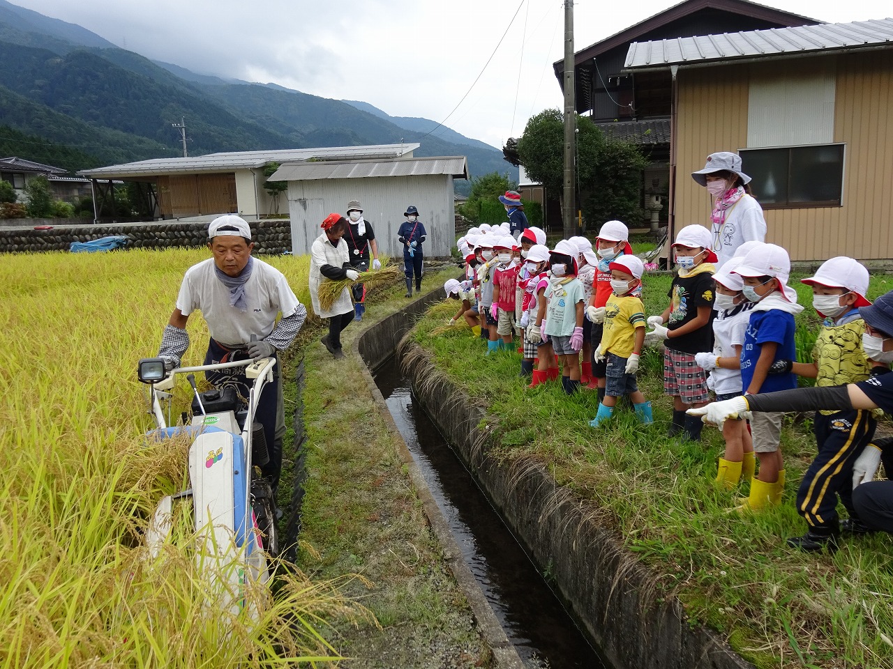 2日前に降った雨で田んぼに入ることができなくなり、子ども達は稲刈りの見学をさせてもらいました。 |