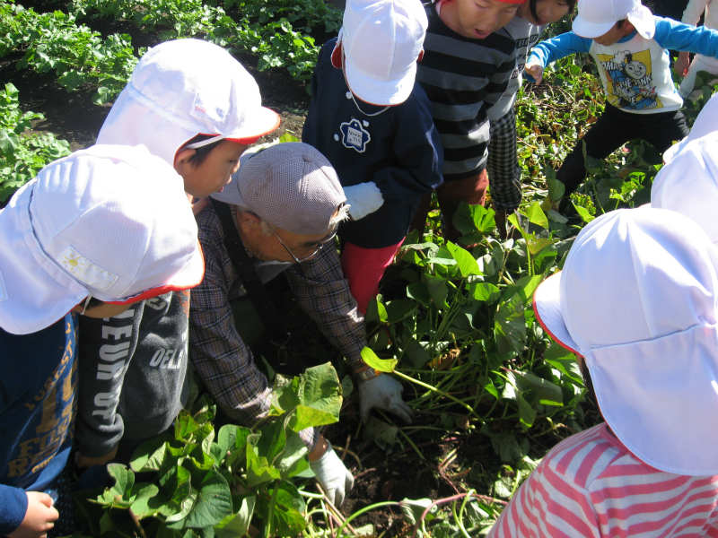 年長さんは春に植えたさつまいもの世話をしてきました。いよいよ収穫です。 |
