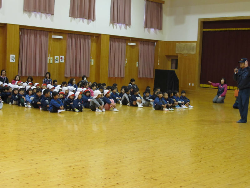 戸外遊び中の地震発生を想定して行う予定でしたが、雨のため急きょ室内遊び中の地震発生、その後給食室からの火事という想定で避難訓練を行いました。 |