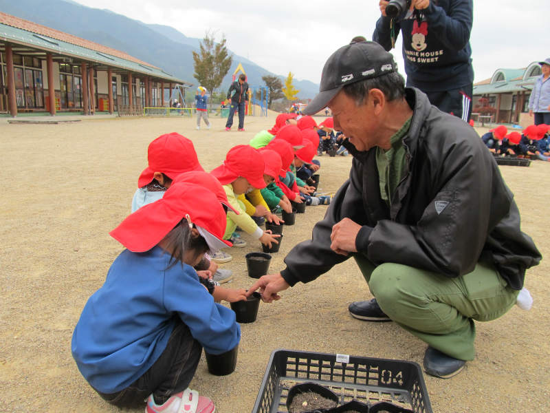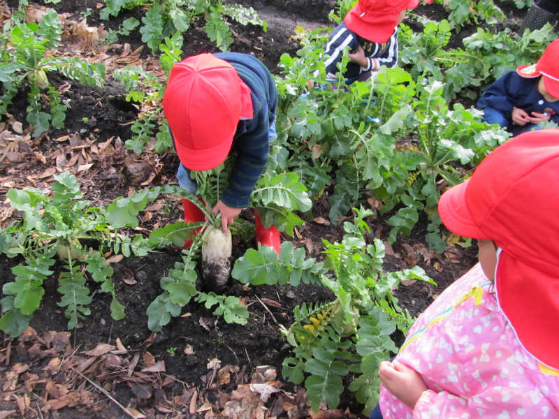 9月に全園児大根の種を蒔きました。年少さんはこれが畑デビューです。 |