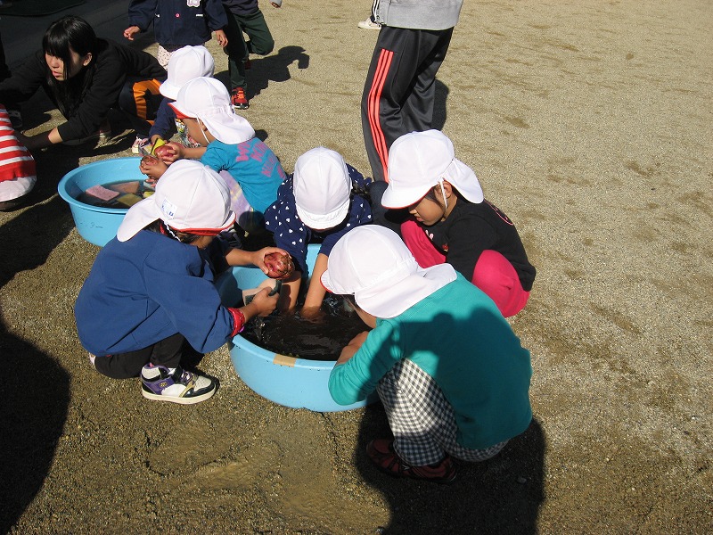 今日年長さんが育てたさつまいもで焼いもを行いました。 |