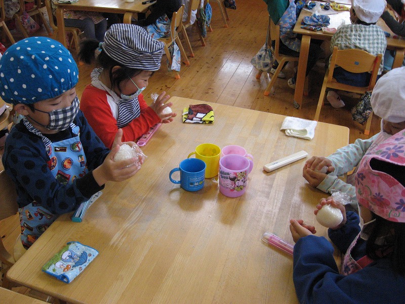 5月に年長さんが田植えをし、9月に収穫を見学し田んぼの先生からいただたお米と、9月にみんなで種植えをし育てた大根を、おにぎりとおでんにして遊戯室で収穫祭を開きました。 |