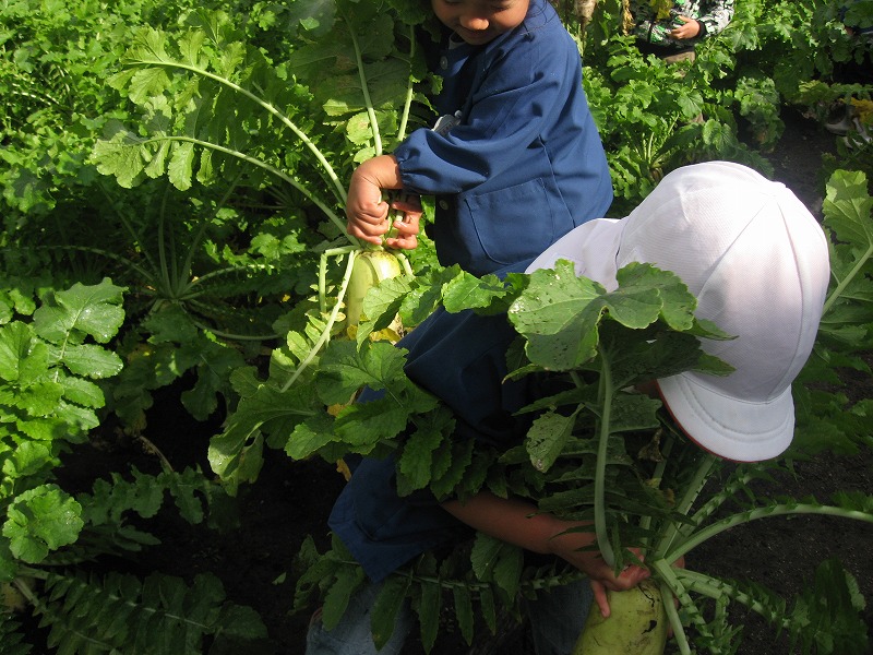 冷たい風が吹く中、全園児で大根の収穫を行いました。 |